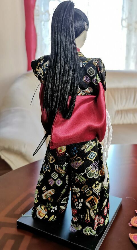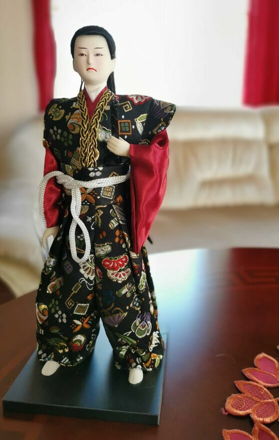 Piękna, japońska lalka Samuraja w tradycyjnym stroju . Lalka stoi na drewnianej podstawie i jest ozdobiona dodatkami. Lalka jest nowa i prezentuje się elegancko, stanowiąc ciekawy element dekoracyjny.Wysokość 30 cm
