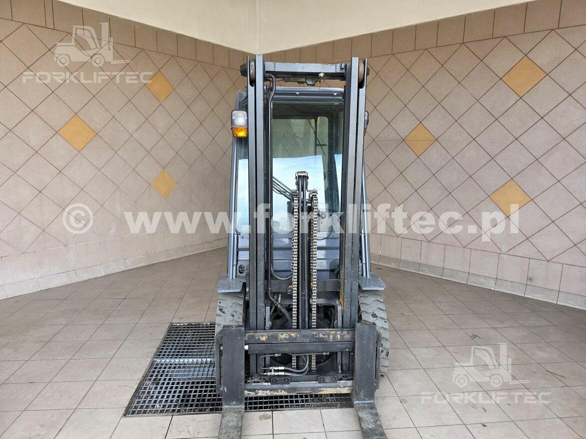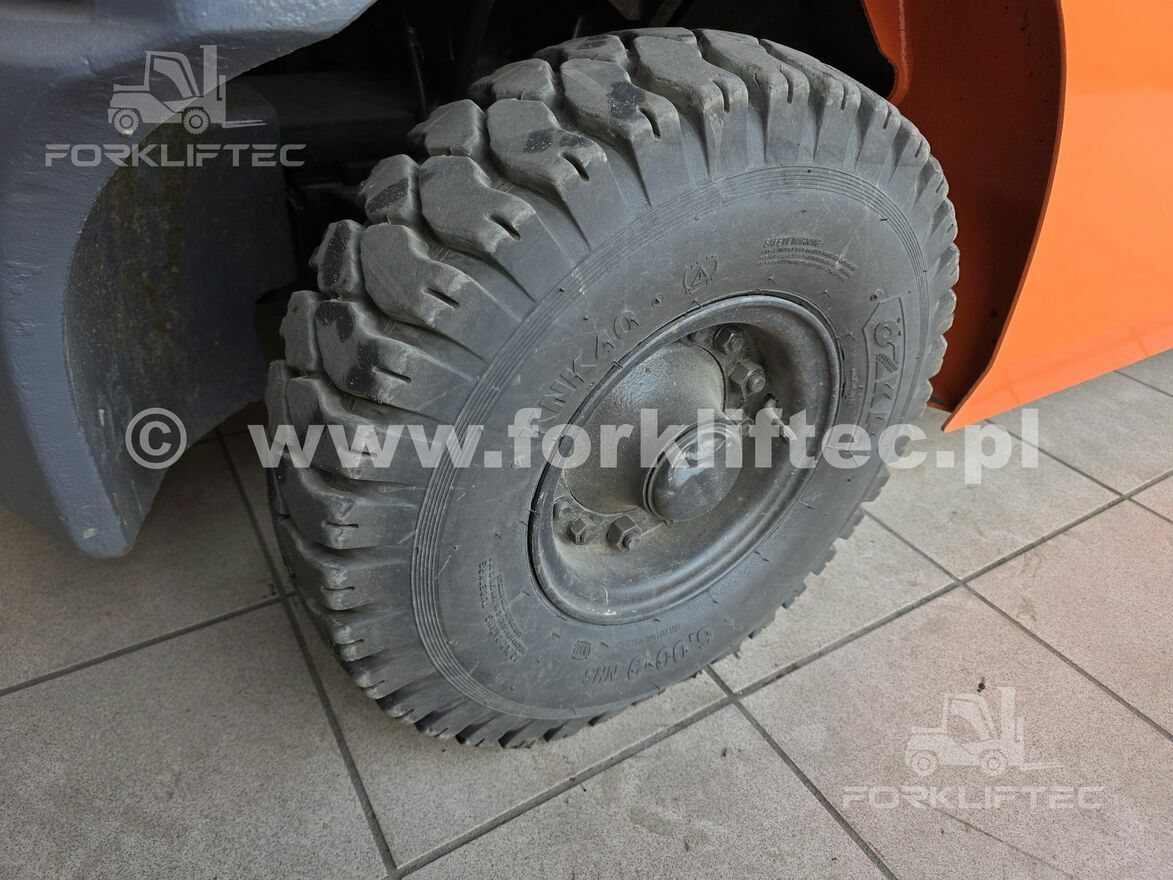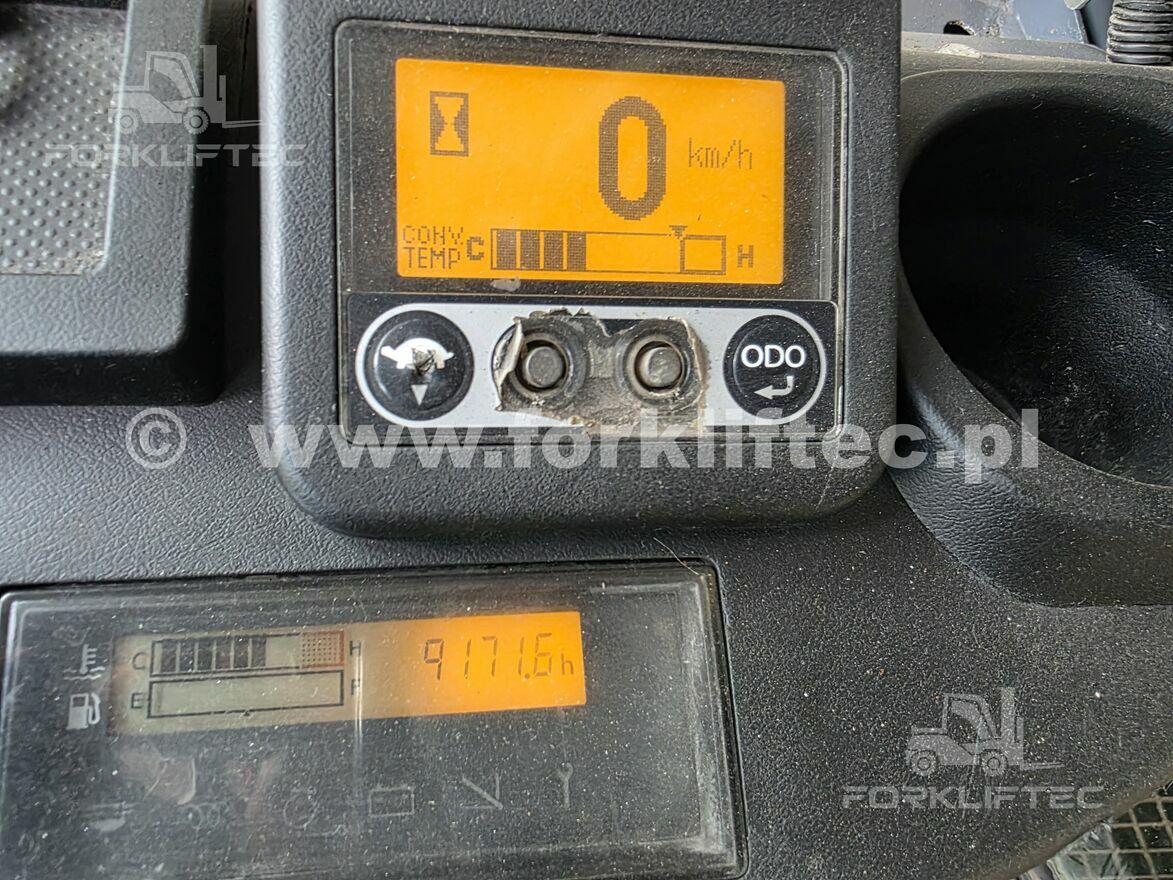 Powyższy wózek zasilany jest napędem diesel i posiada przesuw boczny wideł.